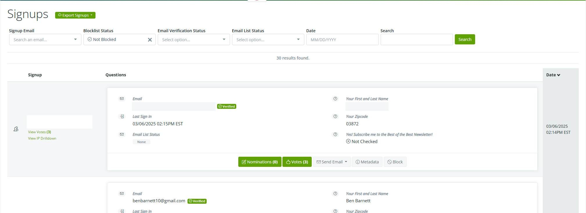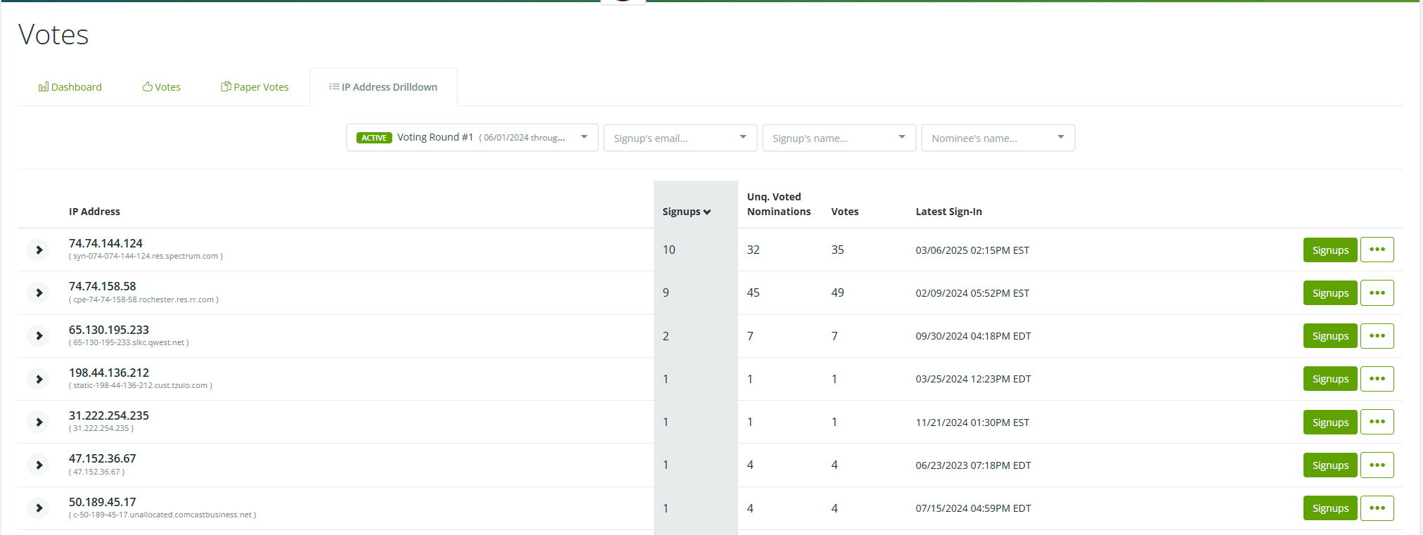 Alongside the Voting tab, we also have Signups. This landing page is similar to our IP Drilldown, allowing your admin team to review individual signups, as well as review the provided answers included in your registration email. This also includes any newsletters they have signed up for.