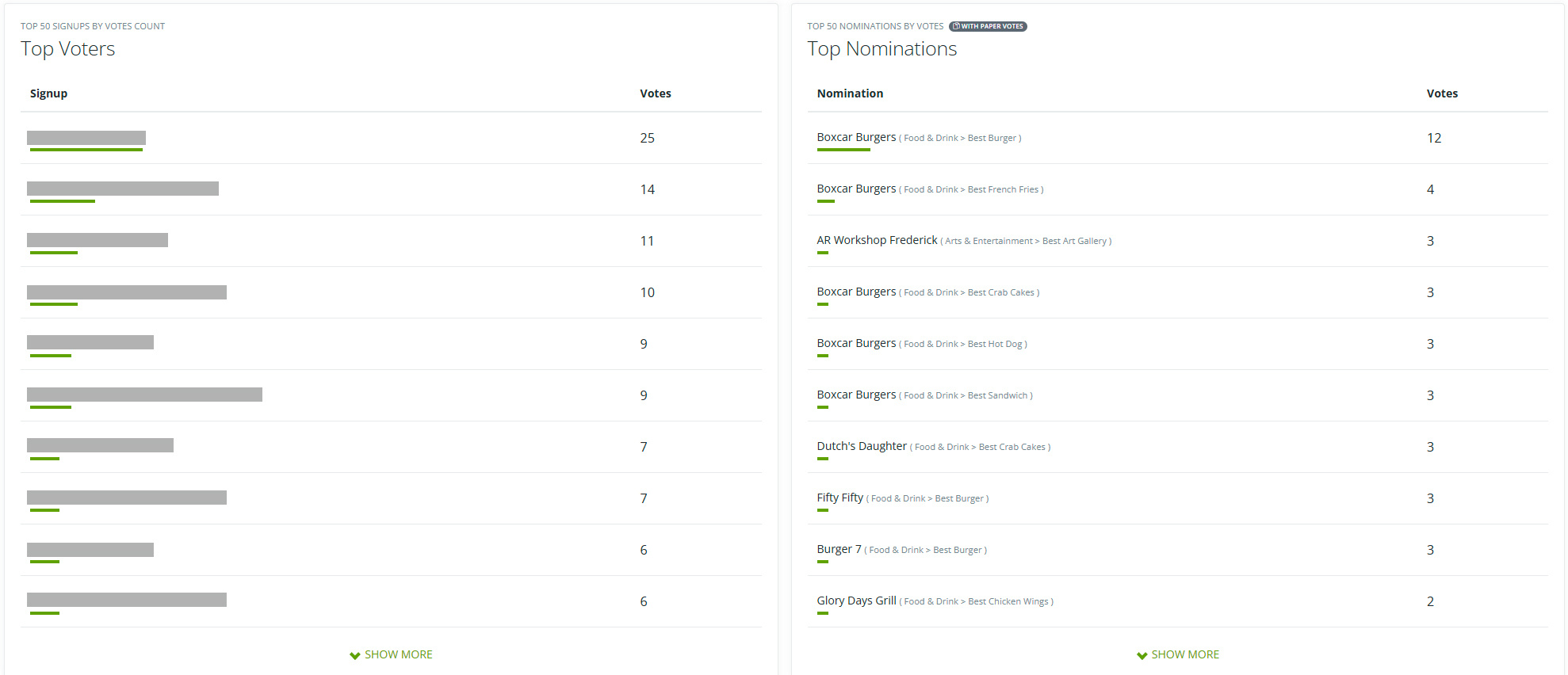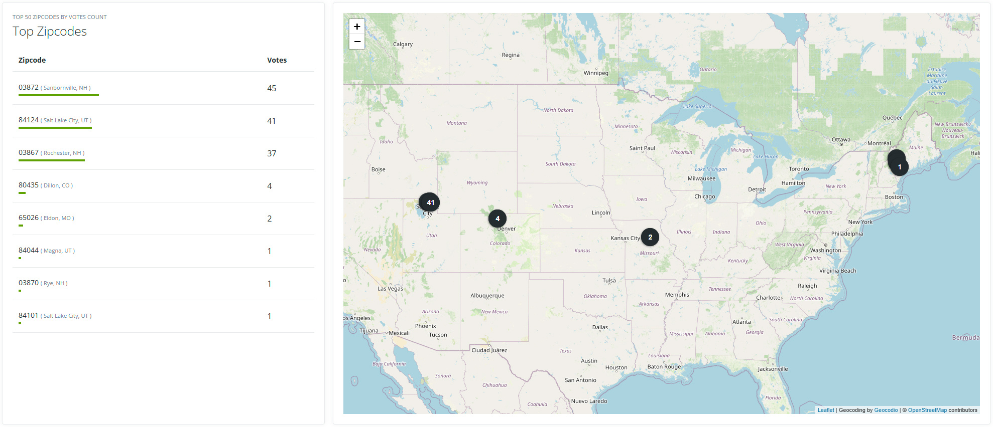 As we move down the page, you'll see Top Voter by email address, Top Nominations, as well as Top Zip code of votes submitted, along with a map for reference.