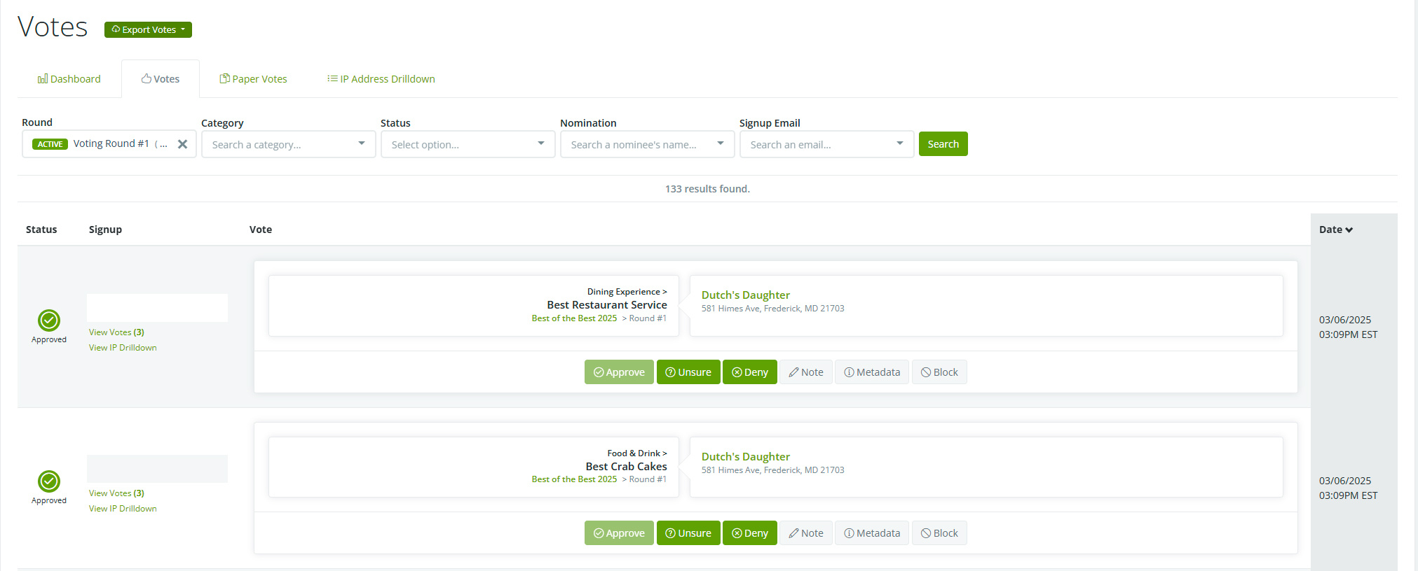 The second tab, Voting, allows you to review all votes submitted. Here you can see all submitted votes within your contest, organized by most recent first. Each entry will show the voter, total number of votes, as well as their IP Drilldown - more on that later.