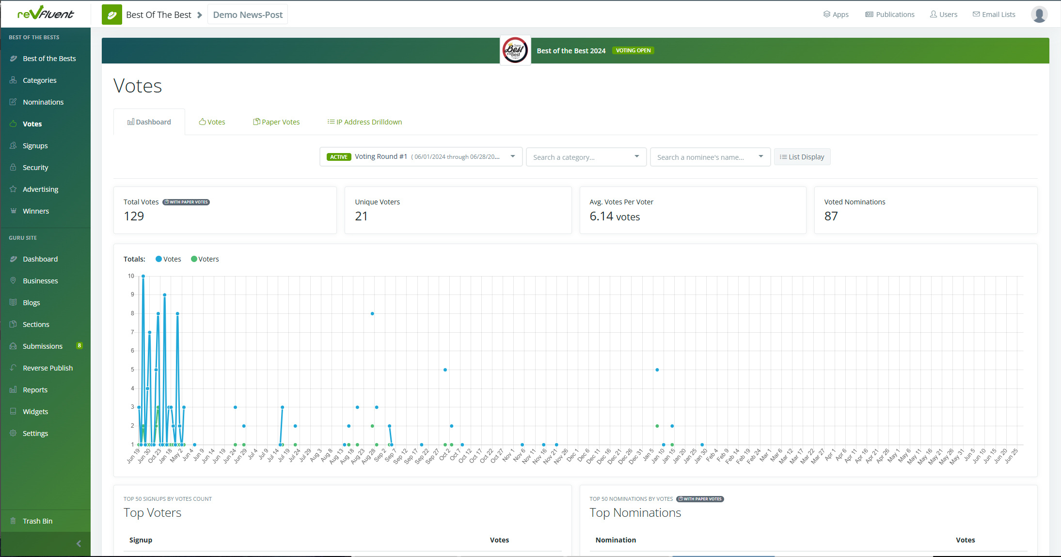 Below is our demo site, showcasing the Voting page of an admin site. The first tab is our Dashboard view including a graph showcasing submitted votes over the life of your contest. As this is a demo, you can expect your graph to look a bit more lively.